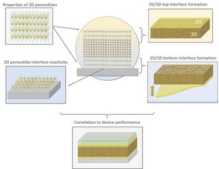 In this project, we will start off with a systematic investigation of pure 2D perovskites and study changes in their electronic structure, optical properties, and their stability depending of the choice and size of the bulky A-site cation. In comparison to their 3D analogues, their ability to form stable interfaces with charge transport materialswill be studied in detail. This is particularly important, as no research on the chemical interaction between 2D perovskites and metal-oxides has been published so far. Next, 2D perovskites will be integrated as thin layers on top and/or below an optimized 3D perovskite absorber material. Detailed analysis of these heterostructures will allow us to unravel how these bulky cations and the specific processing parameters affect the formation, electronic structure, and dimensionality of the respective interlayer. The insights gained from these fundamental studies will be correlated to the electrical characteristics of unipolar (hole-only; electron only) devices based on 2D/3D perovskite interfaces. Ultimately, the most promising combinations of 2D and 3D perovskites will be integrated in solar cells. We are in particular interested in comparing the open circuit voltage with the quasi Fermi level splitting to understand the contribution of parasitic recombination and limited charge extraction to the overall losses in device performance. This will help to clarify whether the presence of 2D interfacial layers can suppress recombination that would otherwise occur if the 3D material is in direct contact with other charge transport layers, such as fullerenes, metal-oxides, etc. Aside from shelf-life under various conditions (inert, ambient, heat), the operational stability of pure and mixed-halide systems is of paramount interest. In the latter systems, we will directly study the impact of 2D/3D interfaces to potentially mitigate the notorious halide segregation.